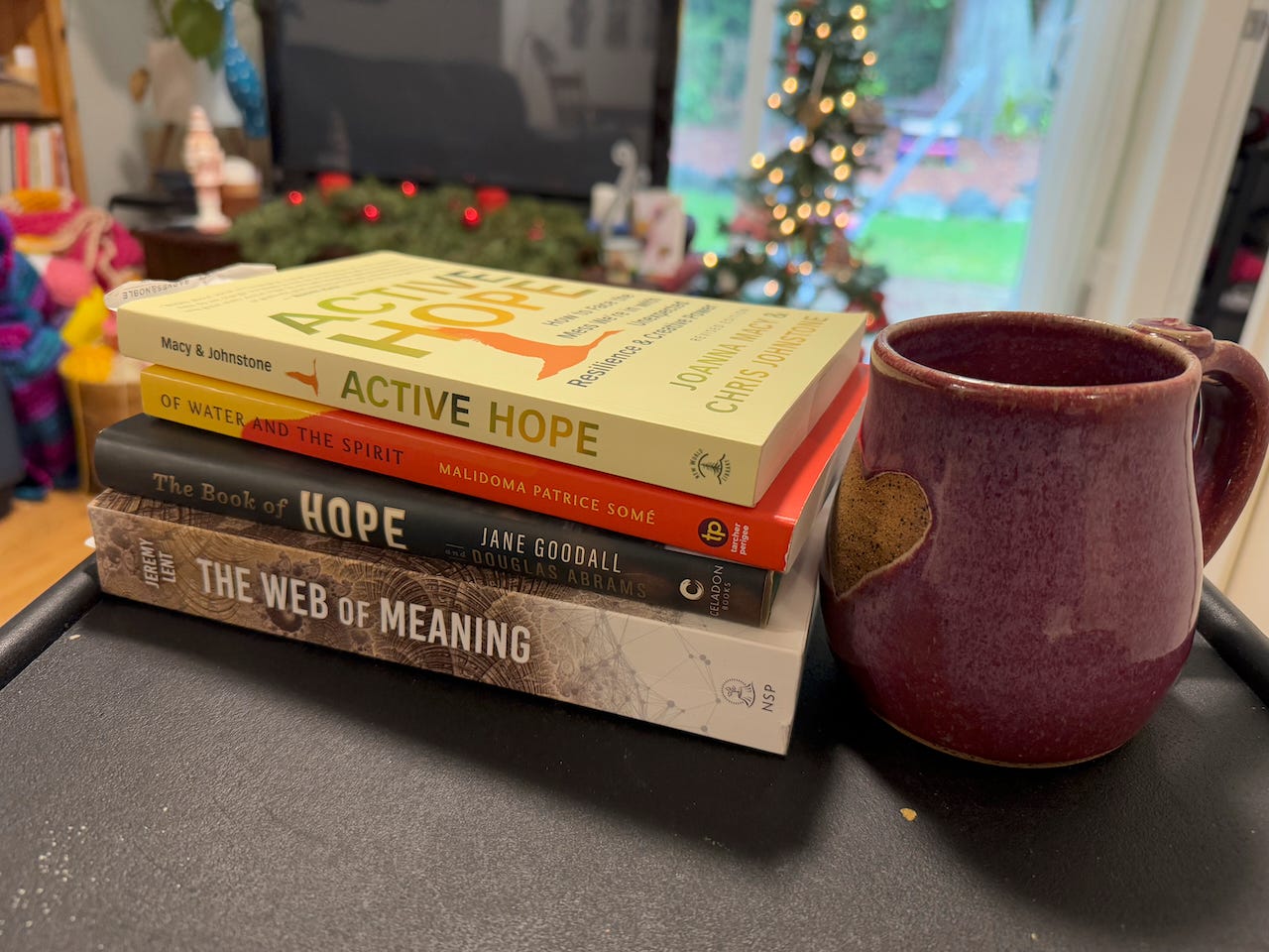 I finished reading The Web of Meaning by Jeremy Lent, then picked up The Book of Hope, by Jane Goodall and Douglas Abrams. Next, I revisited Active Hope, by Joanna Macy, and listened to The Living Mountain by Nan Shepherd. I also got part way through Of Water and the Spirit by Malidoma Patrice Somé.
