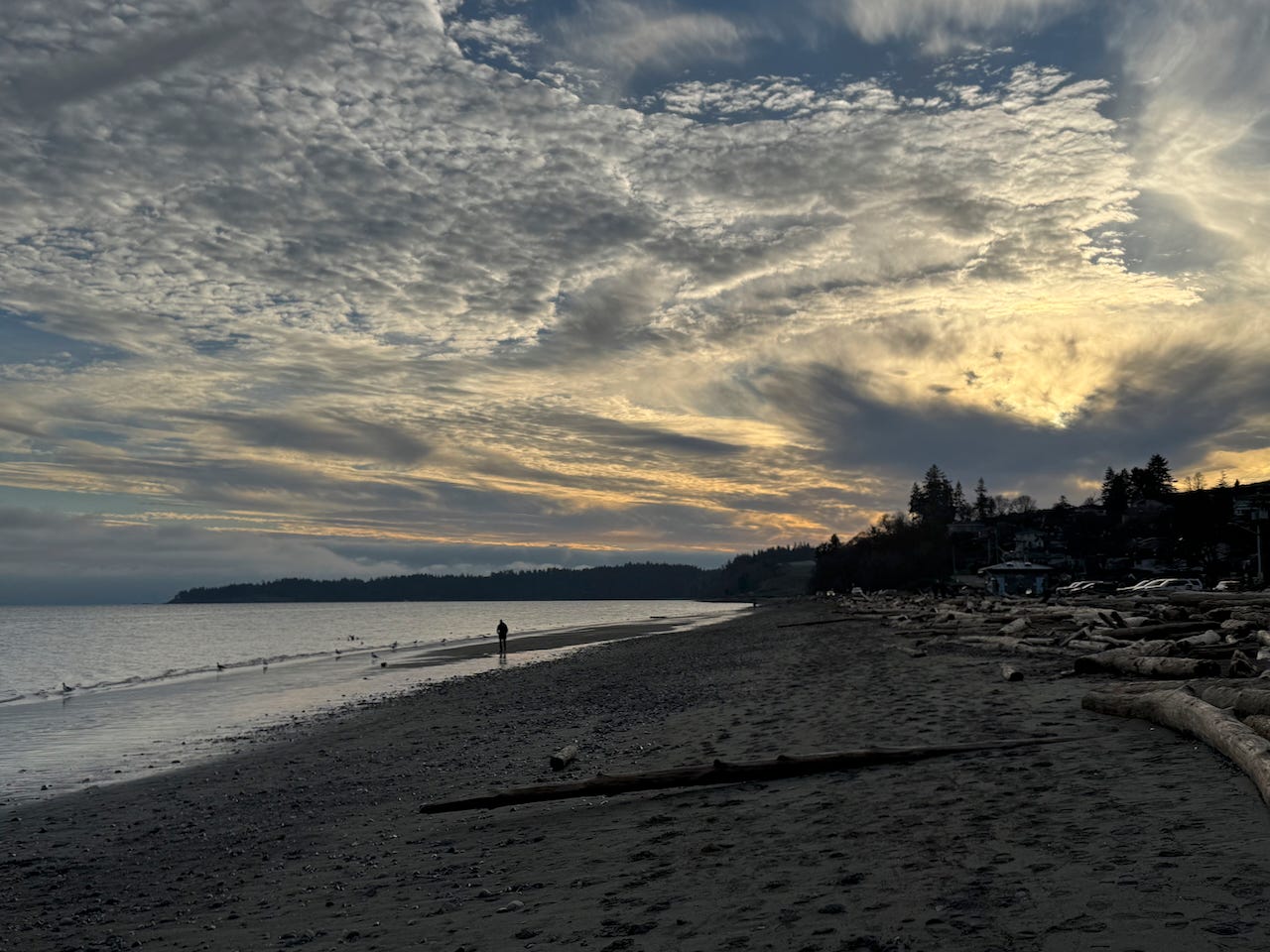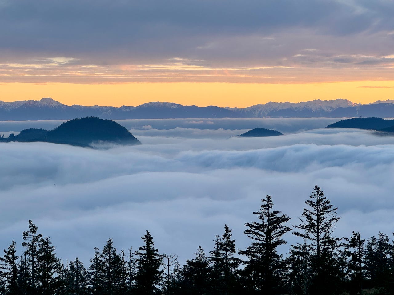 Just before I reached the summit, I broke through the top of the cloud, and the land was suddenly flooded with the muted orange light of the setting sun. I pulled over onto a cliff-edge viewpoint to gaze over the tops of the clouds nestled in the inlet. On the far horizon, I could see the mountains of the Olympic Peninsula, across the U.S. border.