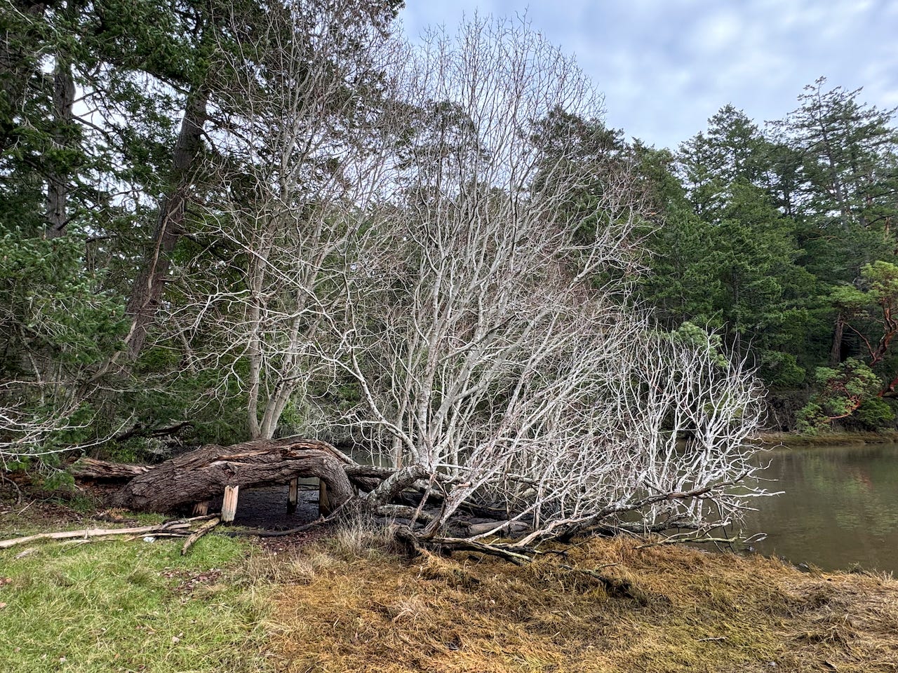 There at the edge of the water was a magnificent tree – a Scouler’s willow, if my plant identification app is correct. Lying horizontal, suspended above the ground in places by left-behind pilings from an old footbridge, was a huge, ancient tree. It was hard to tell whether it was an old tree that had toppled but kept sending its young branches heavenward in defiance of death, or a dead tree that had offered itself up as a nurse log for younger trees to root themselves in. Either way, it was beautiful, resilient and stubbornly hopeful.