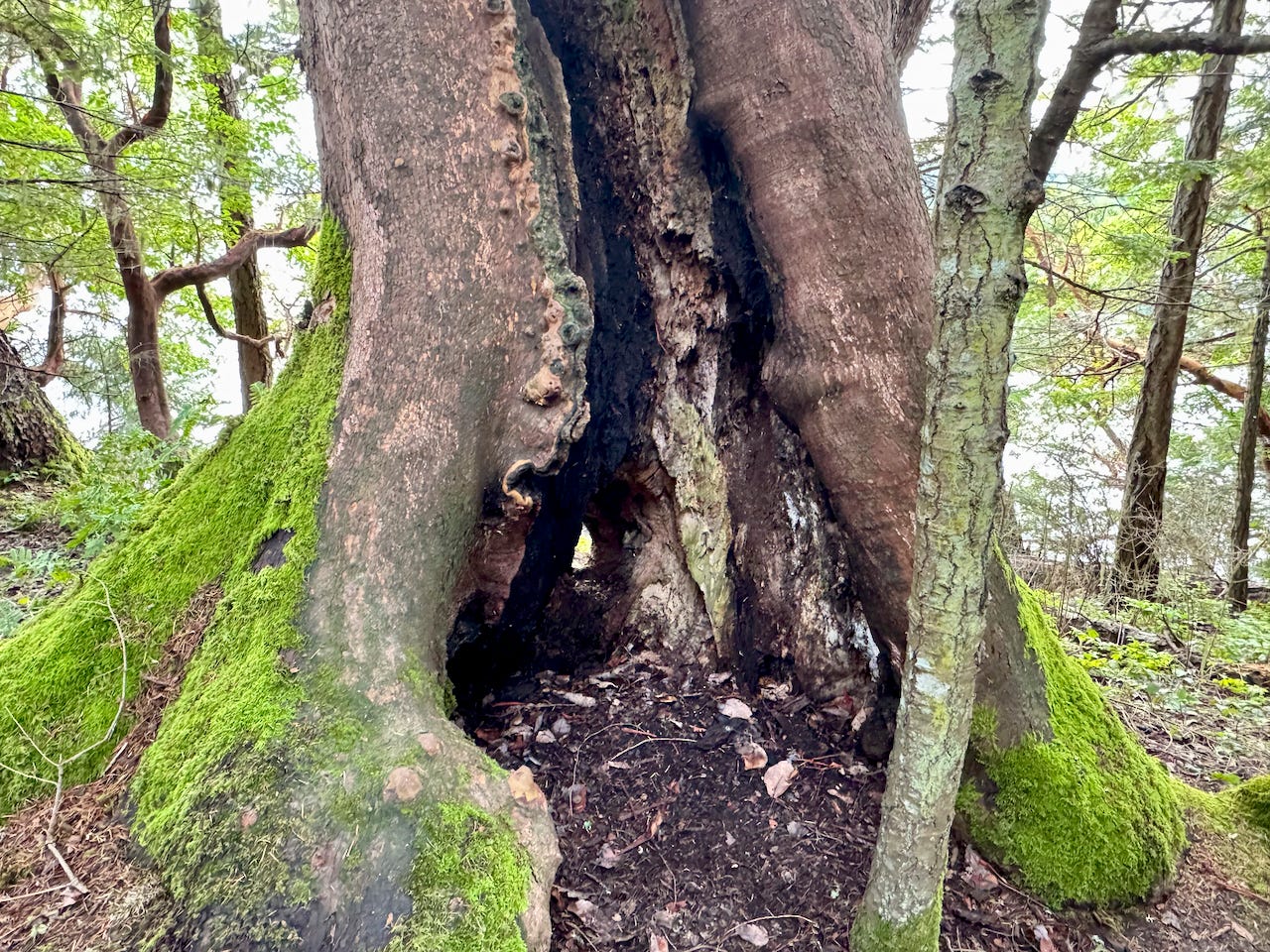 Further along the path, another ancient tree invited my attention. A huge arbutus tree stood just up the hill from the path. Near its base was a five-inch hole that let me see right through the tree to the other side. I climbed the small hill and circled the tree. On the side facing away from the trail, her massive trunk was hollowed out, like a fairy house with a window through which magical forest creatures could watch people on the path. Though the interior showed signs of fire, this solid old tree was stubbornly alive.